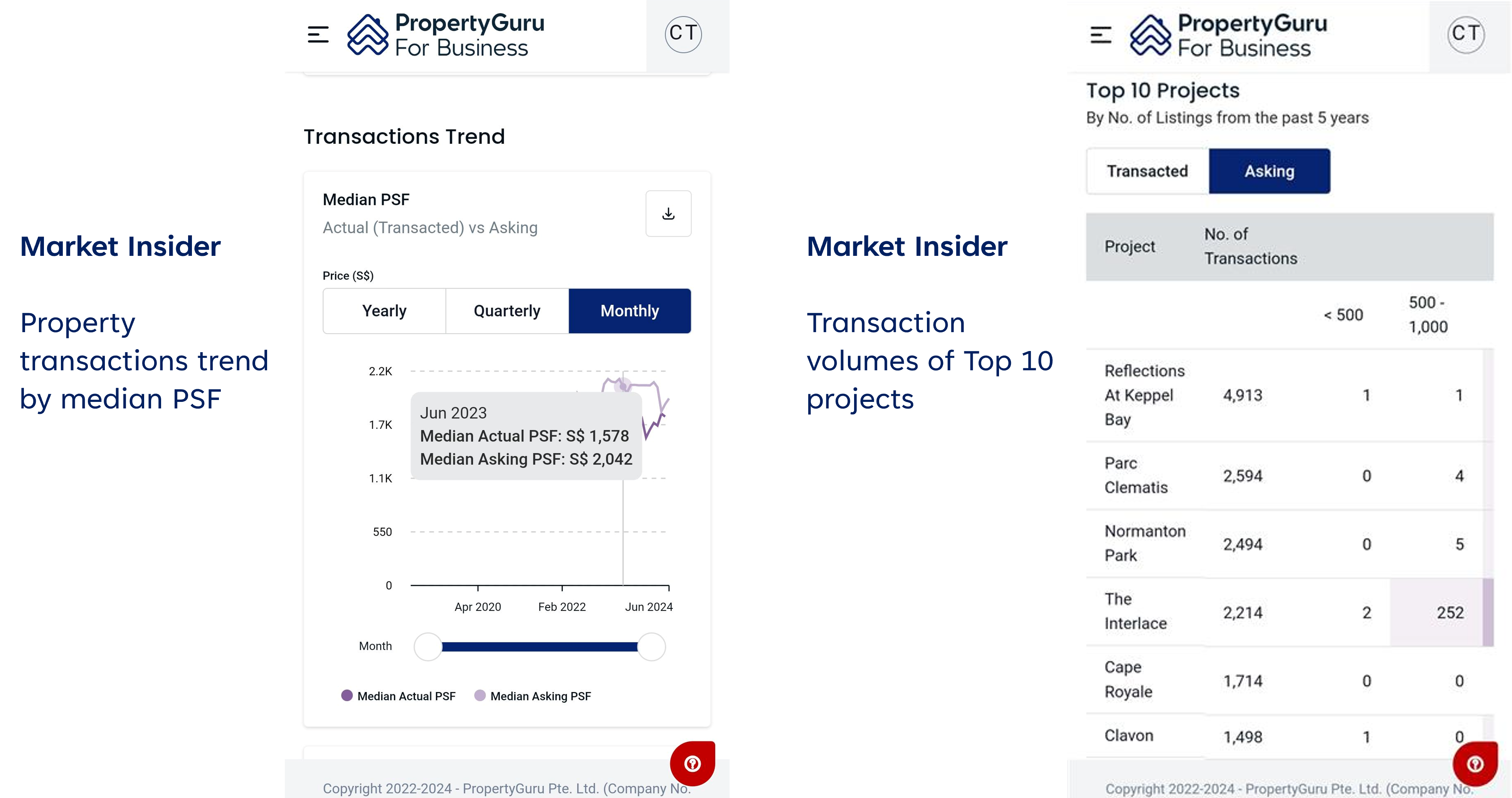 Market Insider provides transaction volume trend comparisons, median PSF comparisons, top 10 projects by transaction volume, latest transactions from the past 14 days and more. It provides valuable insights into property sales trends and new projects, offering a macro view of the market.