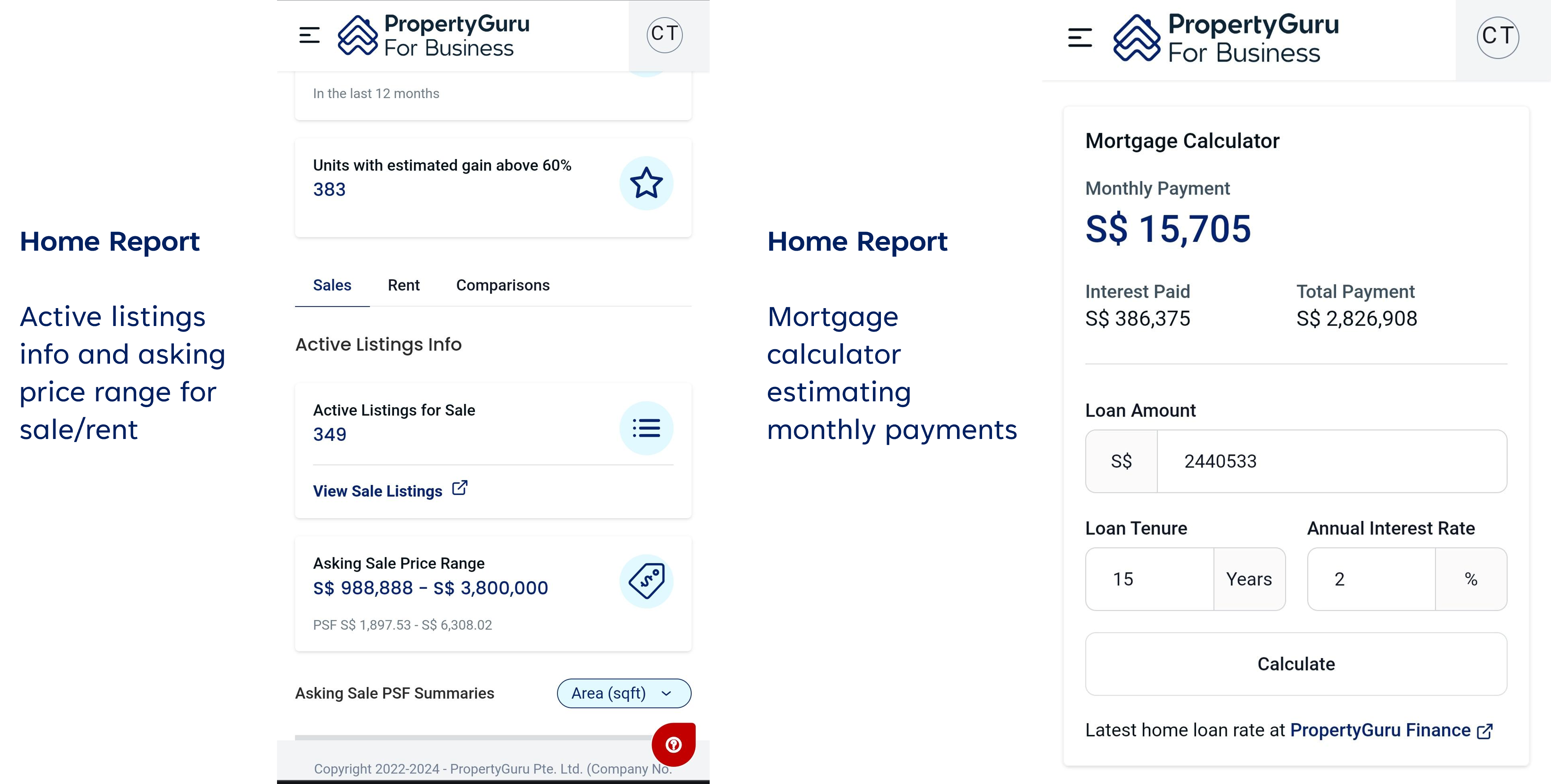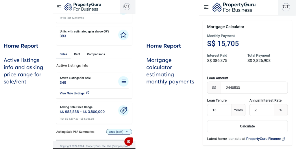 Home Report offers in-depth property analysis, including estimated buy/sell price, estimated gain/loss, past transactions, active listings, and asking price range for sale/rent. It also provides a map view of nearby amenities within a filtered distance. This simplifies research, guiding both buyers and sellers towards informed pricing and property decisions. For buyers, it also displays estimated monthly mortgage, helping them understand their affordability.
