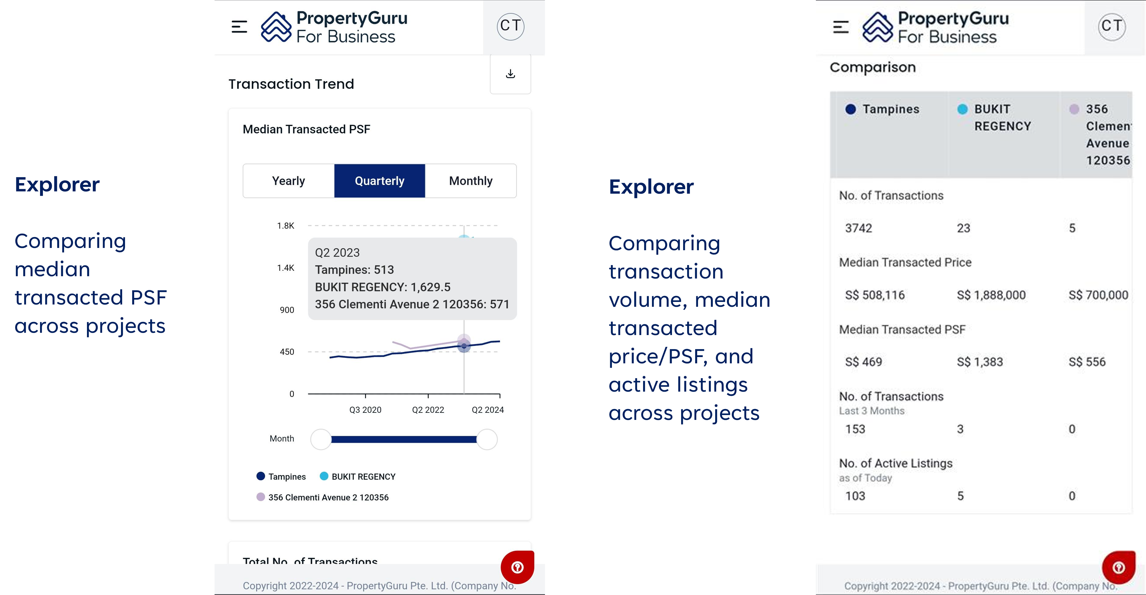 Explorer simplifies data with easy-to-understand visuals, empowering you to share clear property comparisons with potential buyers. It’s a quick, interactive tool allowing advanced filtering of historical transaction data across various property segments like projects, HDB estates, and districts.
