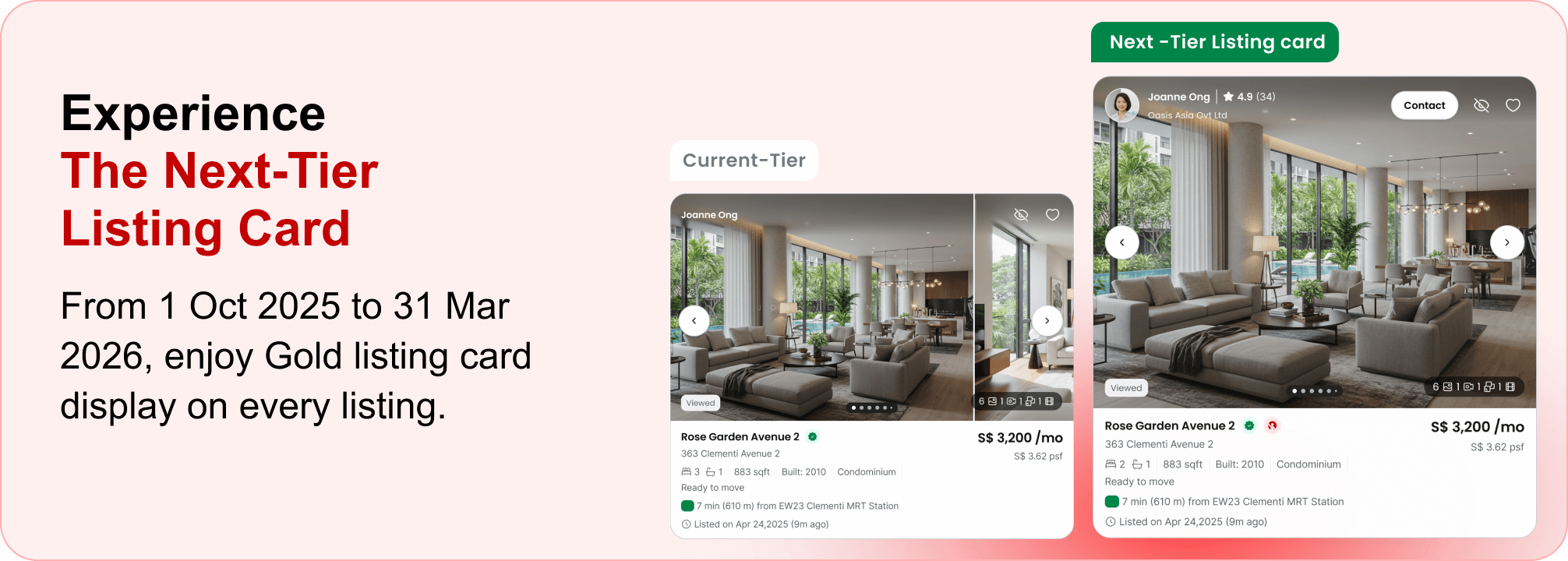 From 1 October 2025, we’re introducing redesigned packages, along with a pricing update to better support how agents grow today. These enhancements are built to help you win with credibility, reach, and speed on Singapore’s largest and most trusted property marketplace.